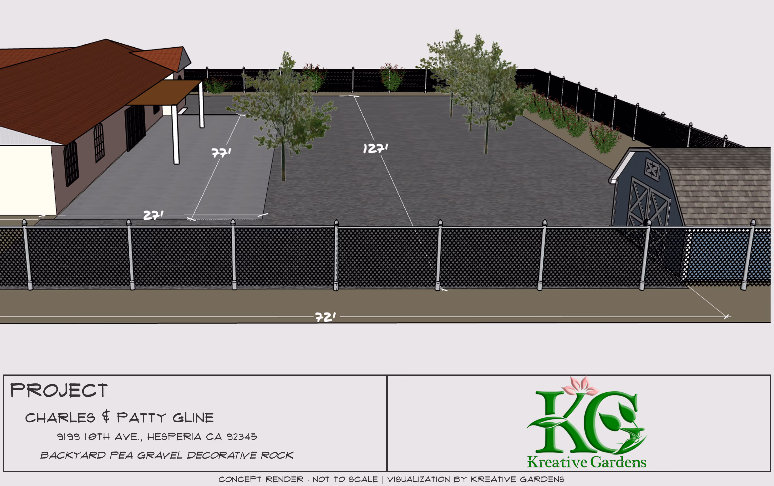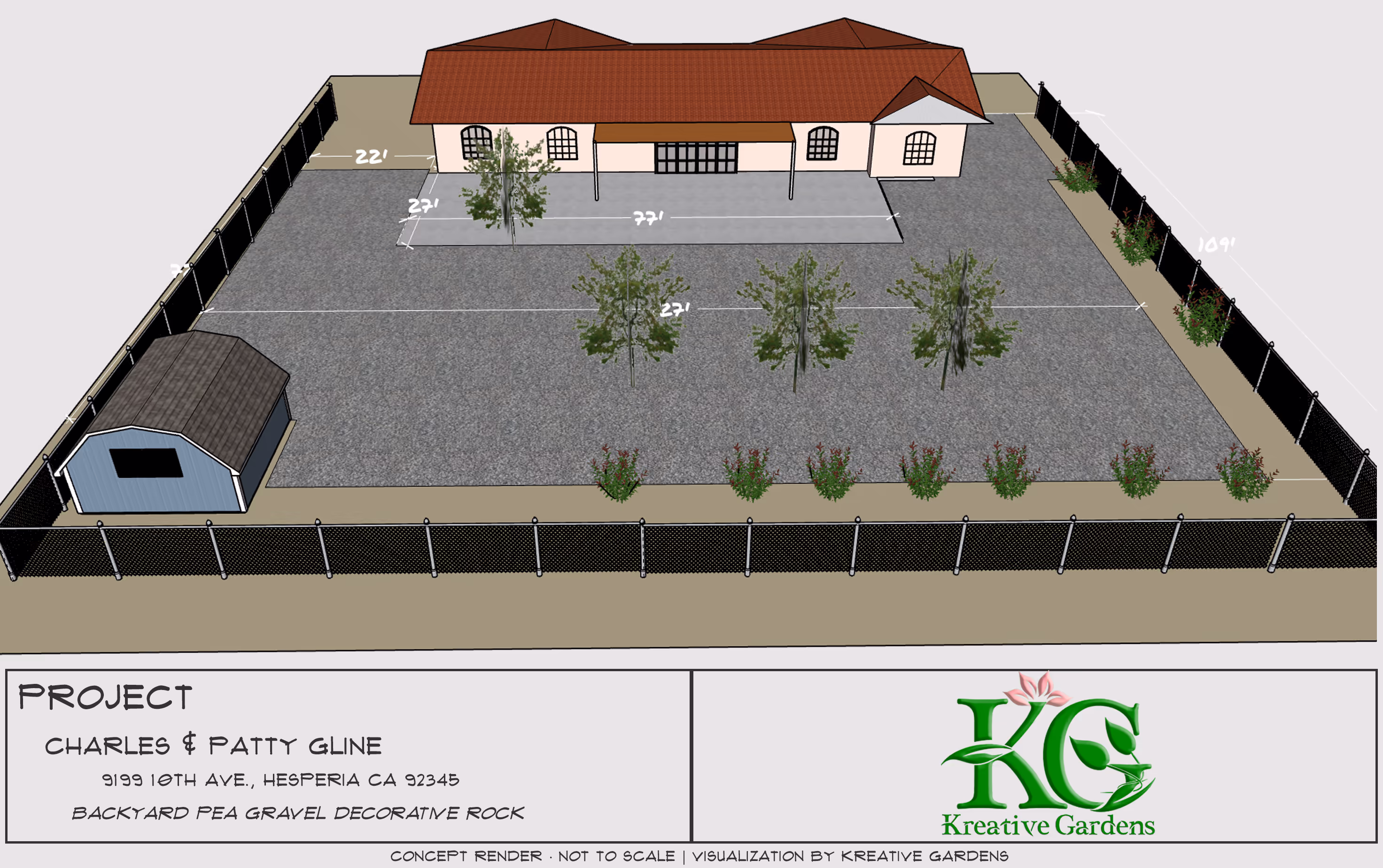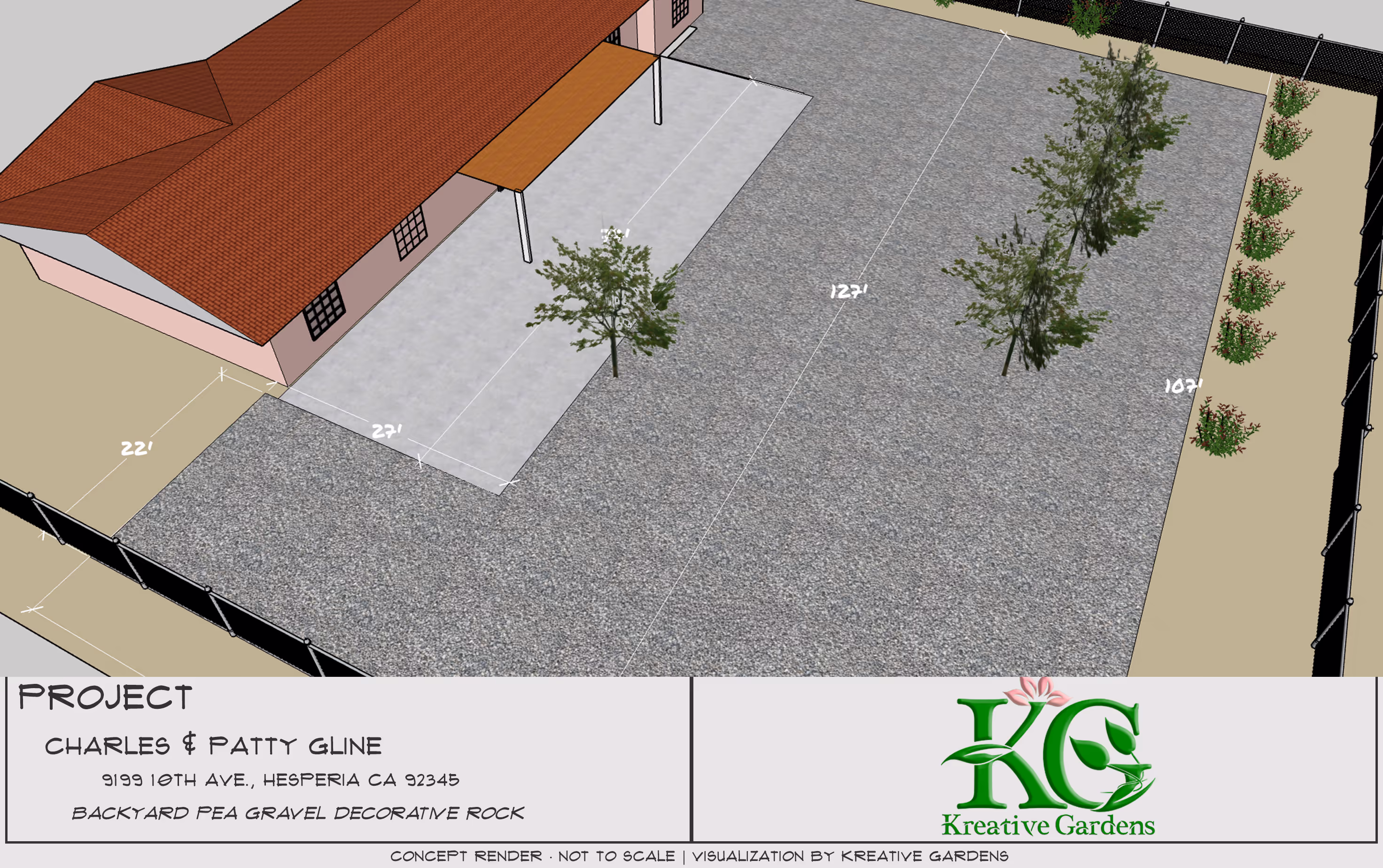 This project involves the installation of decorative Mountain Ash pea gravel across approximately 9,000 square feet of the backyard at the property located at 9199 10th Ave, Hesperia, CA, owned by Charles and Patty Gline.