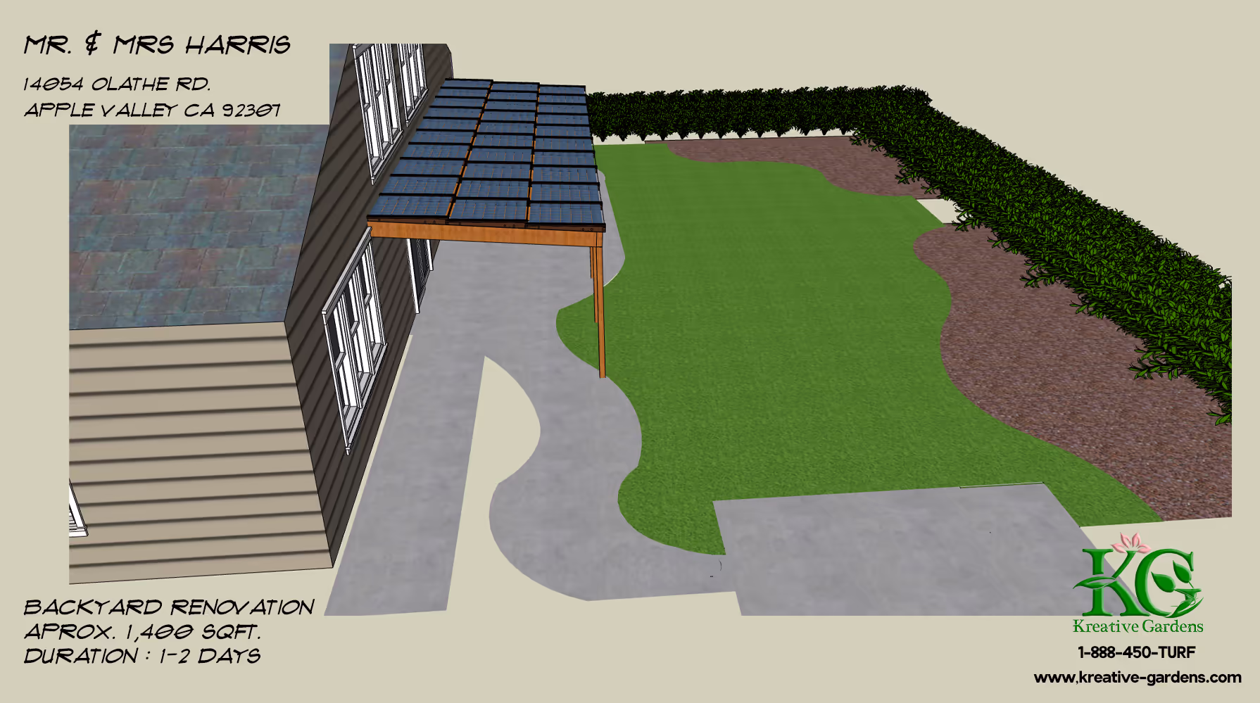 Kreative Gardens proposes the installation of Marathon artificial grass within the existing curbed decomposed granite area at the Corey Harris residence in Apple Valley, California. The proposed turf area is approximately 1,400 square feet, following the current irregular layout and using the existing curbing and concrete as defined boundaries. The existing wine red decorative rock outside the turf area will remain in place.