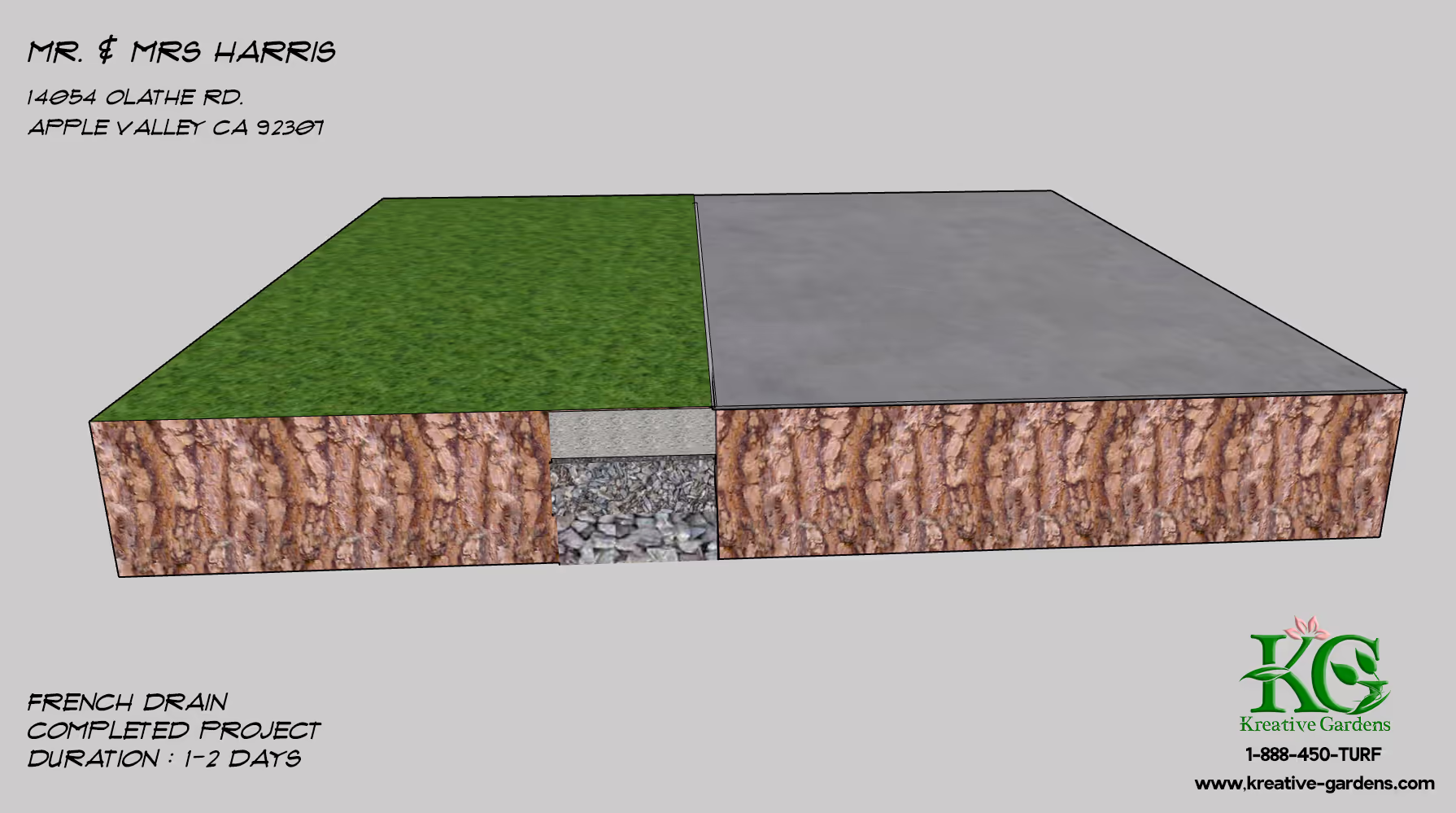 Full import and installation of base material throughout the turf area is not included. Only light grading, surface preparation, and compaction where needed will be performed by Kreative Gardens, along with the localized base cap within the French drain upgrade area.